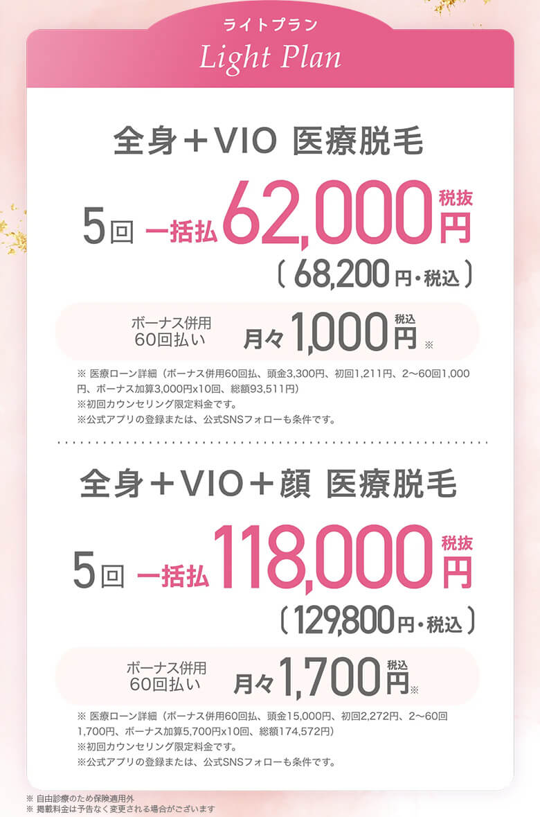 一方、熱破壊式脱毛にも対応している「全身+VIO脱毛5回 プレミアムプラン(税込218,000円)」は、価格帯としては他の医療脱毛クリニックとほぼ同水準となっています。