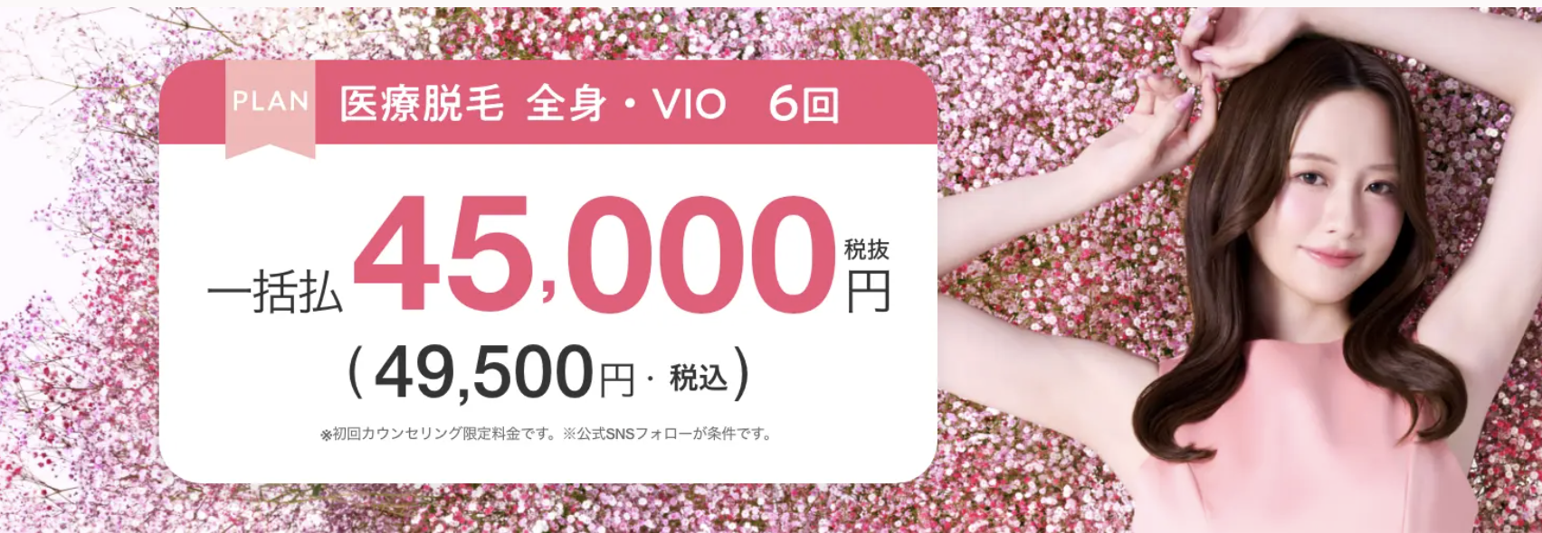 中でも注目されているのが、全身+VIO脱毛6回が税込49,500円(税抜45,000円)という、医療脱毛としては非常に手の届きやすい価格設定です。